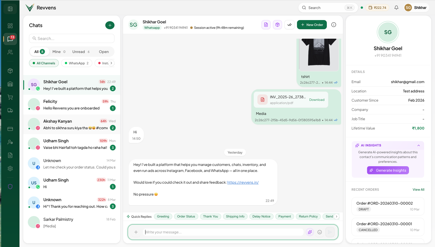 One inbox for WhatsApp, Instagram & Facebook. Reply faster, create orders from chats, and let AI handle the rest.